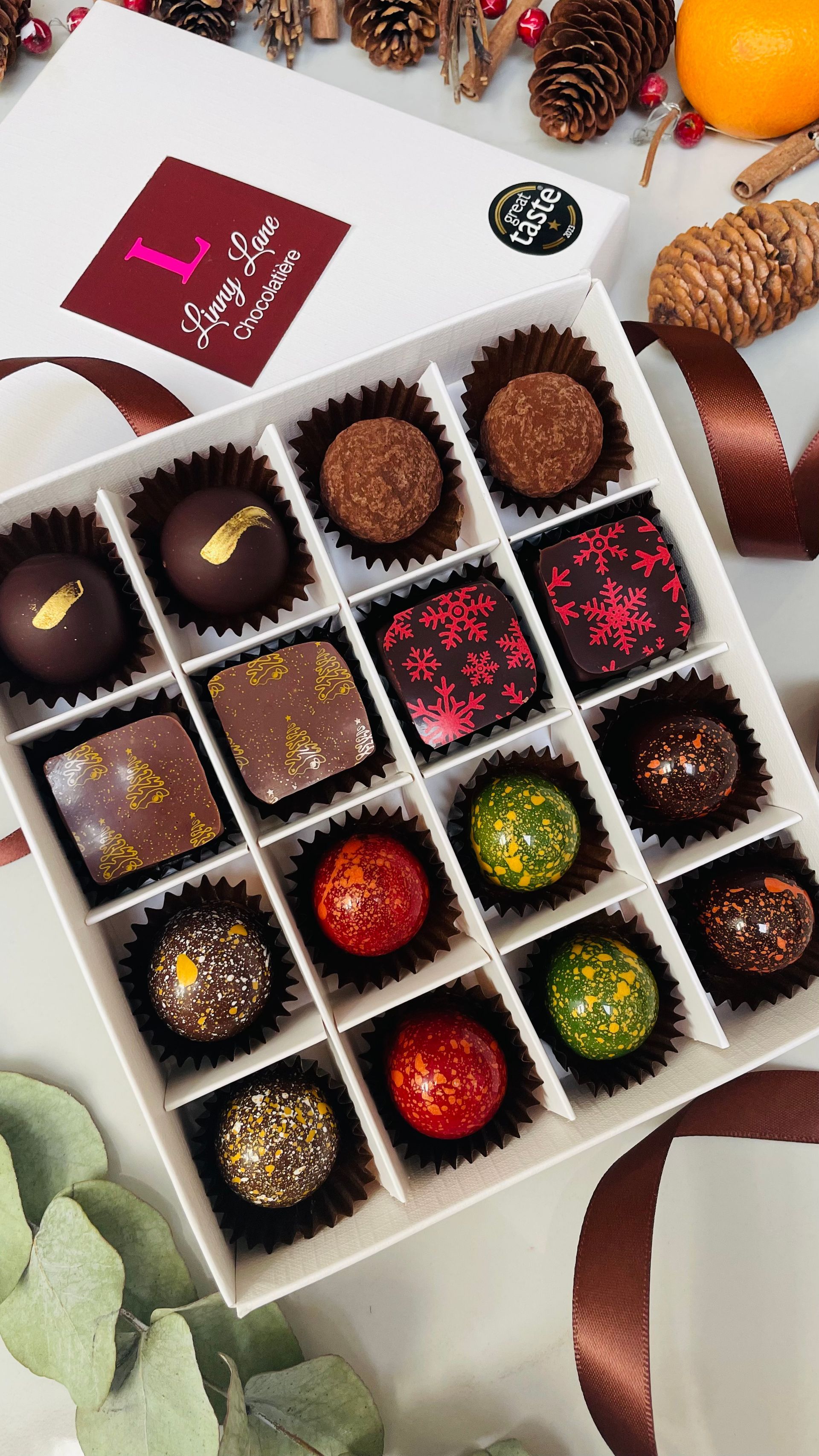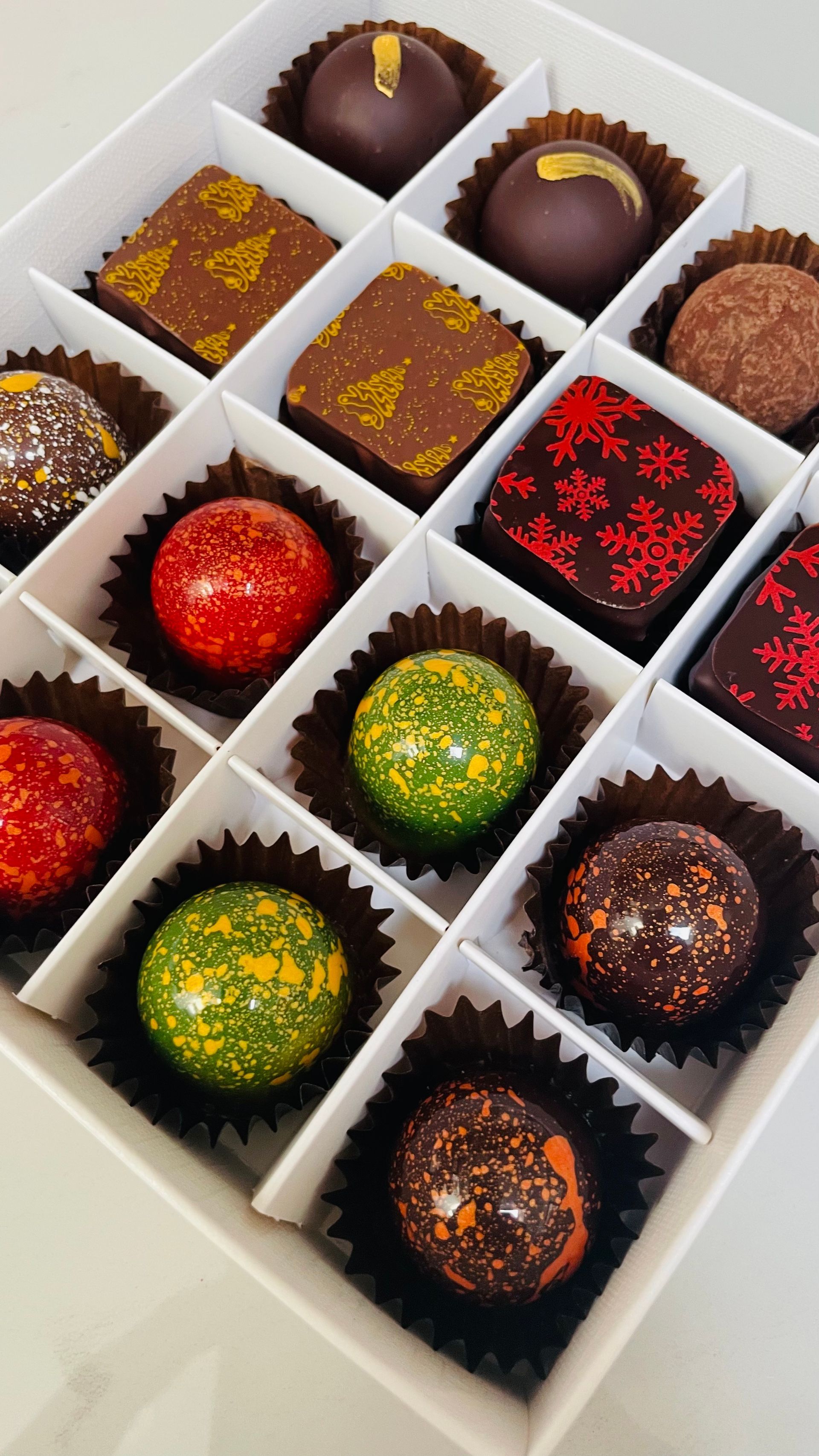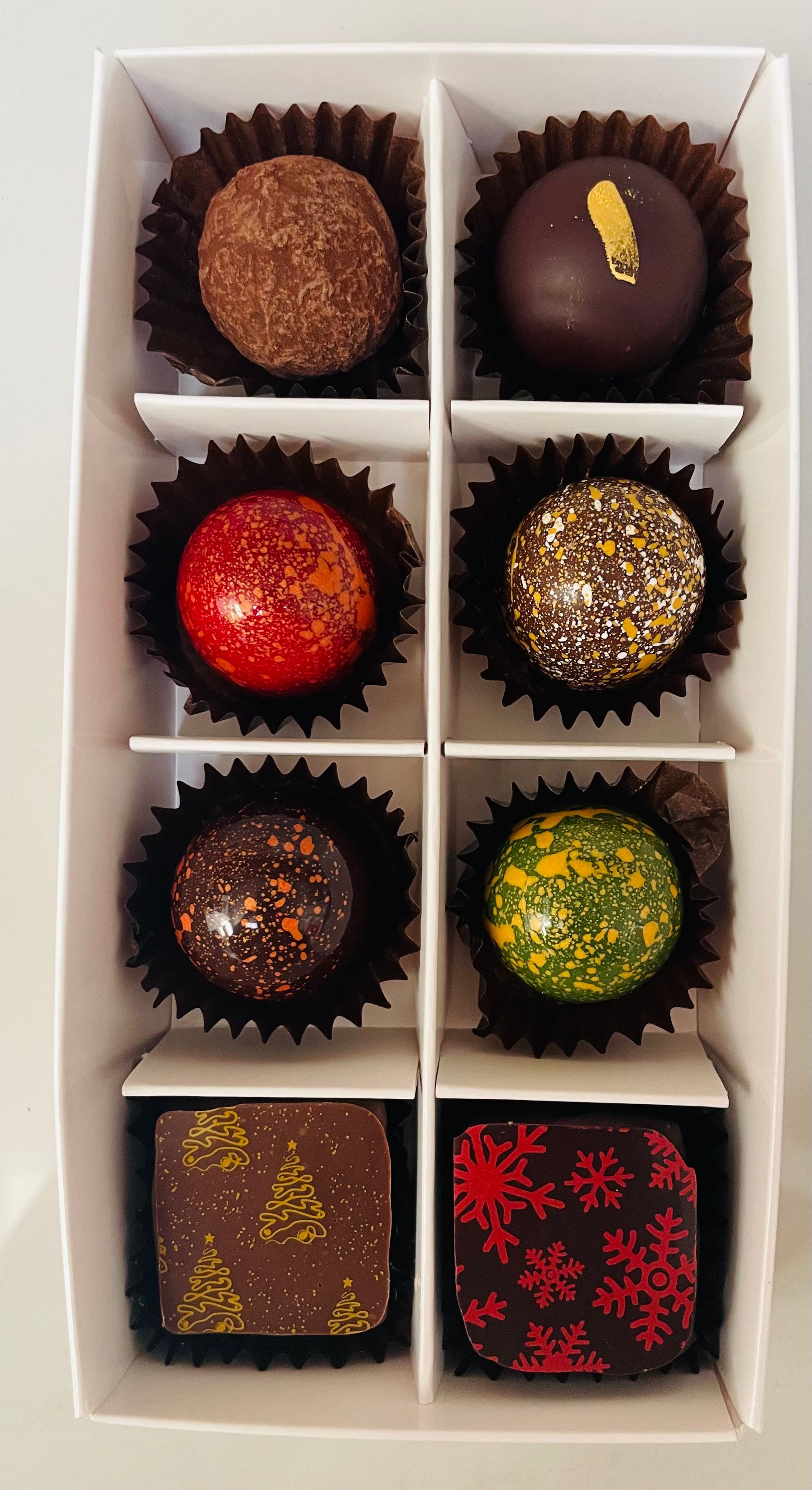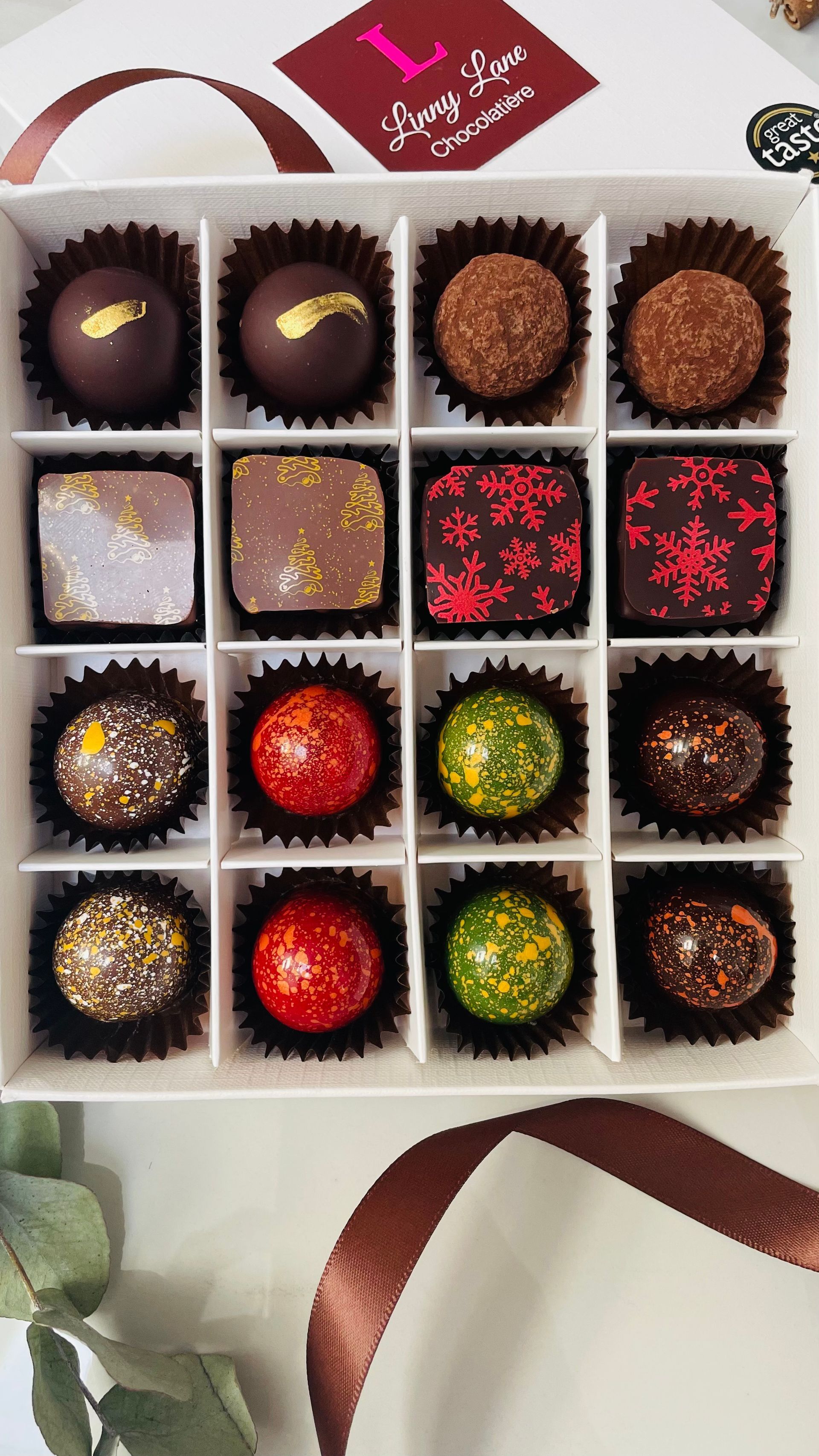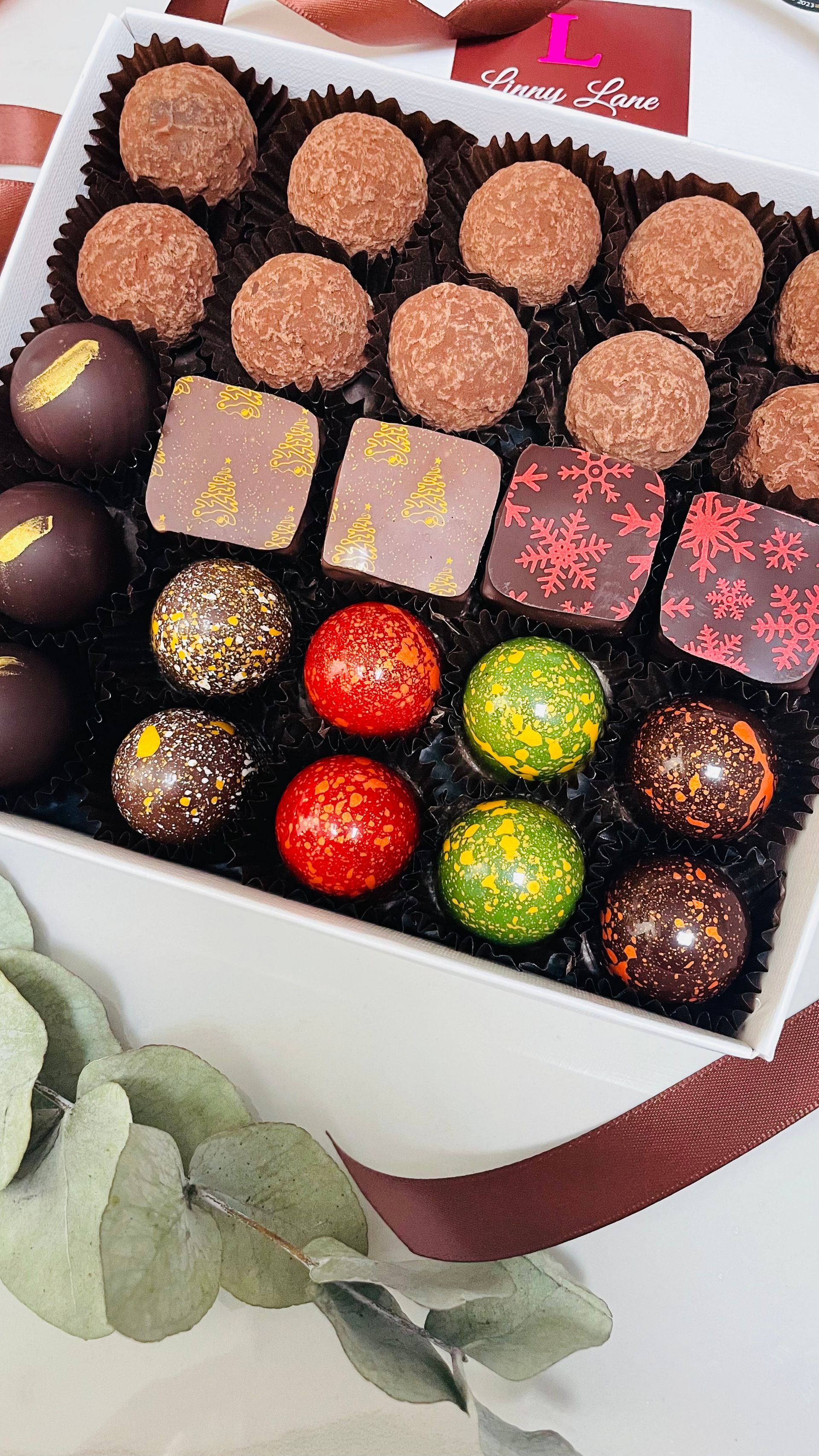Delight in the festive December Chocolate box, Milk, Dark, Blonde and White chocolates, caramels and pralines featuring traditional Christmas favourites.